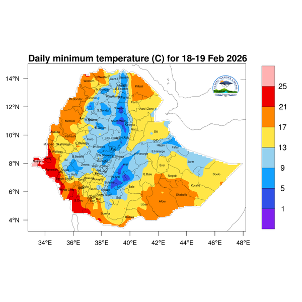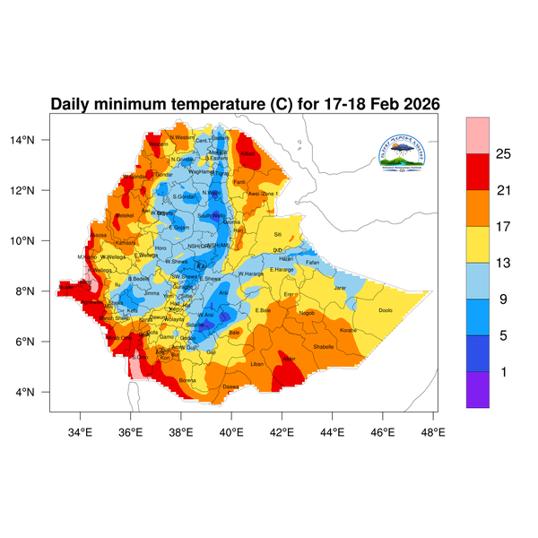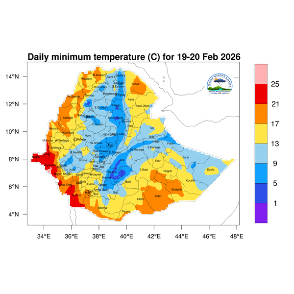 East Amhara, central and southern highlands of Oromia will experience minimum temperatures below 5 °C.