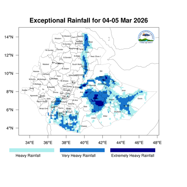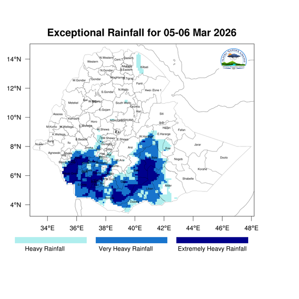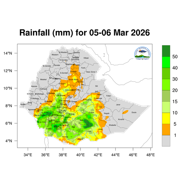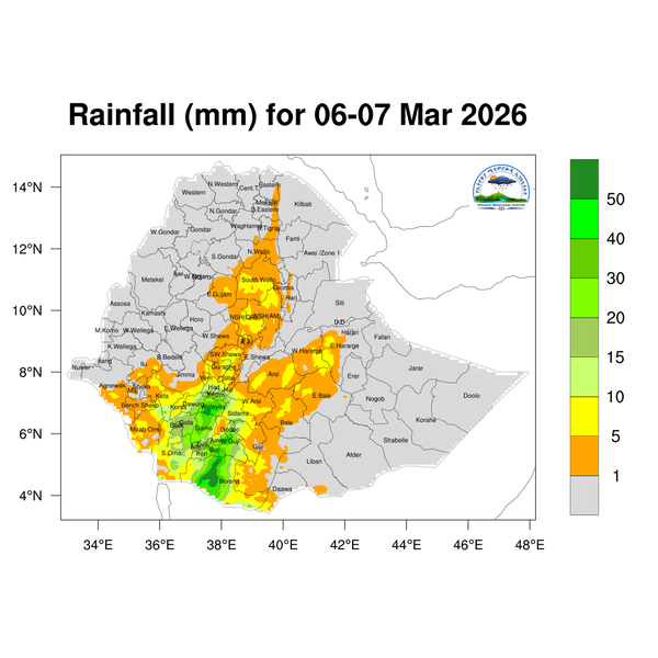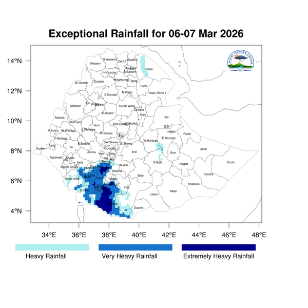 Light to heavy rainfall is expected over southern Ethiopia, Sidama, and central Ethiopia; the southwestern Ethiopia region; central, southern, and eastern Oromia; southern Tigray; eastern Amhara; and Somali