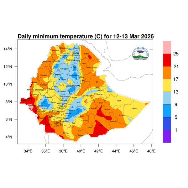 Light to heavy showers is anticipated for eastern, central, and southern Tigray, as well as central and eastern Amhara, parts of the western, central, eastern, and southern highlands of Oromia, northern Somali, central Ethiopia, Sidama, and the Southern and Southwestern regions of Ethiopia.