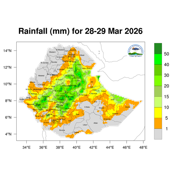 Light to heavy rainfall is expected across,southern, central and eastern Amhara, southern ,southern Afar, Oromia, Central Ethiopia, Southwestern Ethiopia, Sidama, South Ethiopia, except border of southern eastern Somali regions.