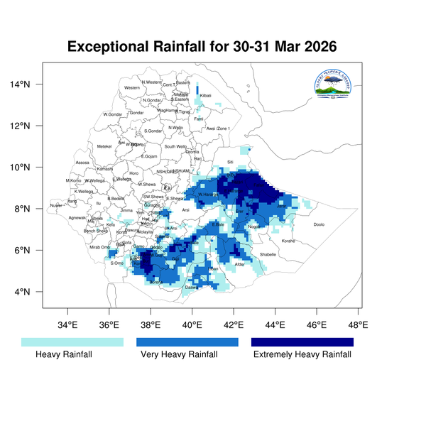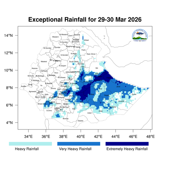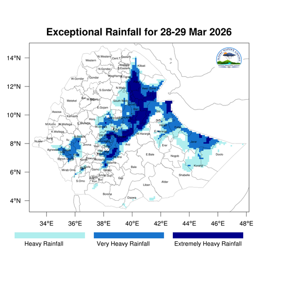 Light to heavy rainfall is expected across,southern, central and eastern Amhara, southern Tigray, northern and southern Afar, Gambella, Oromia, Central Ethiopia, Southwestern Ethiopia, Sidama, South Ethiopia, Somali regions.