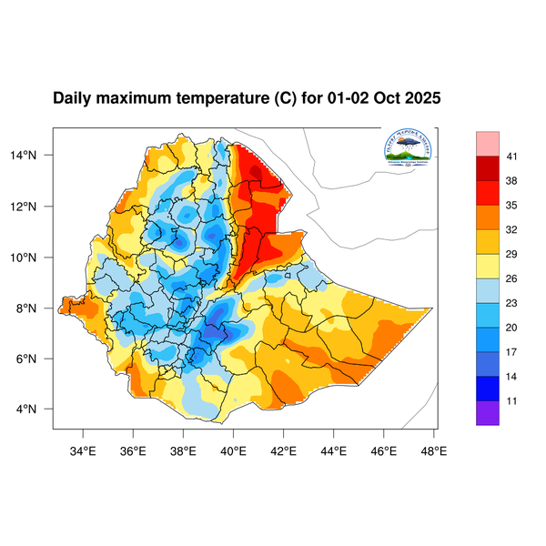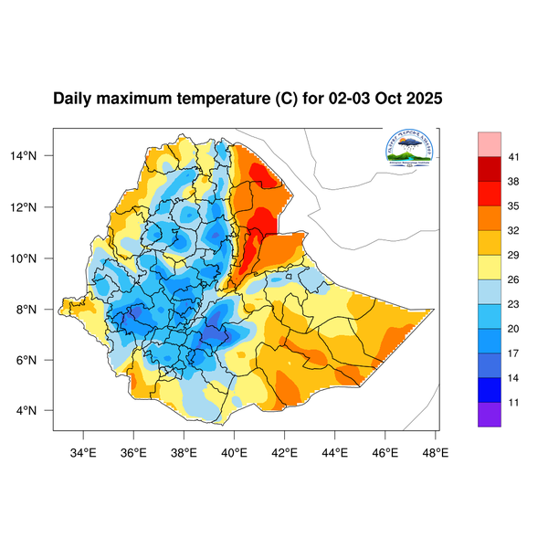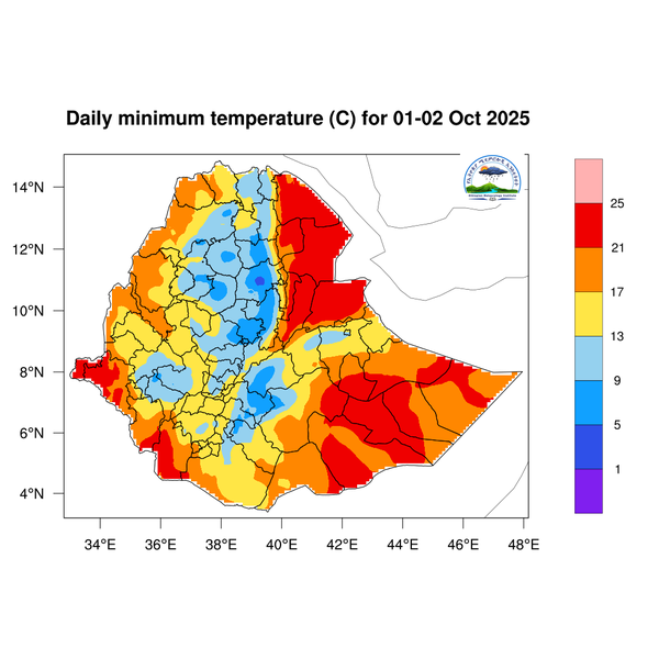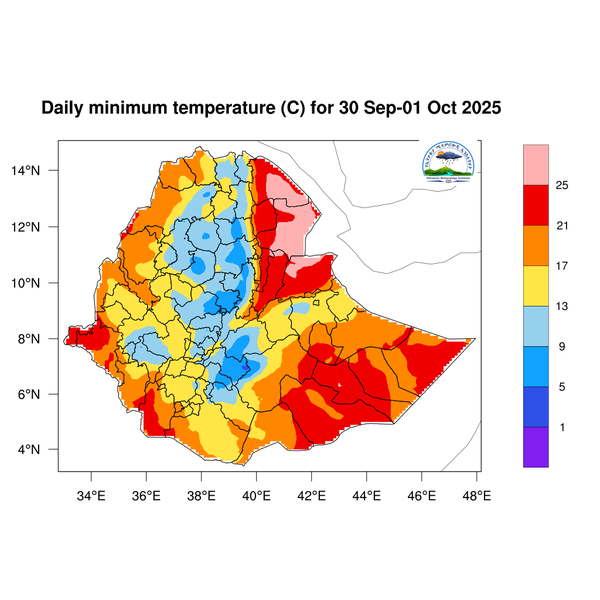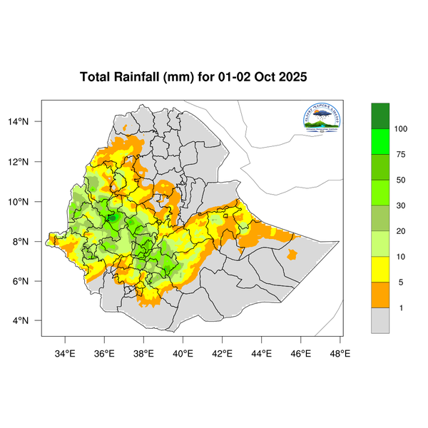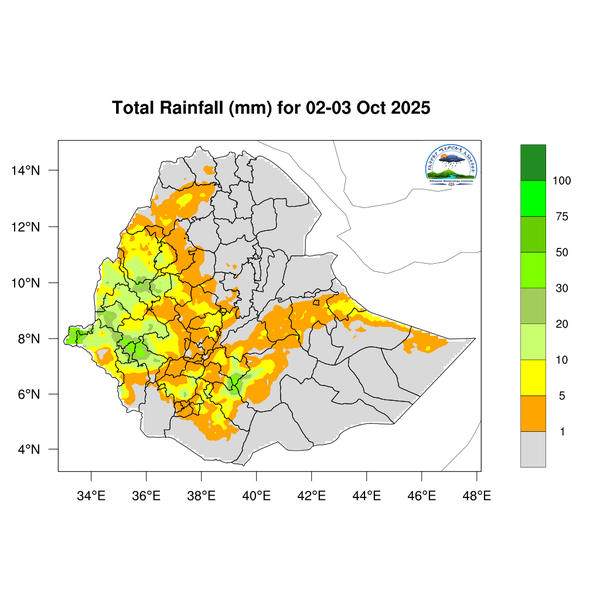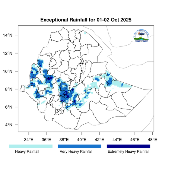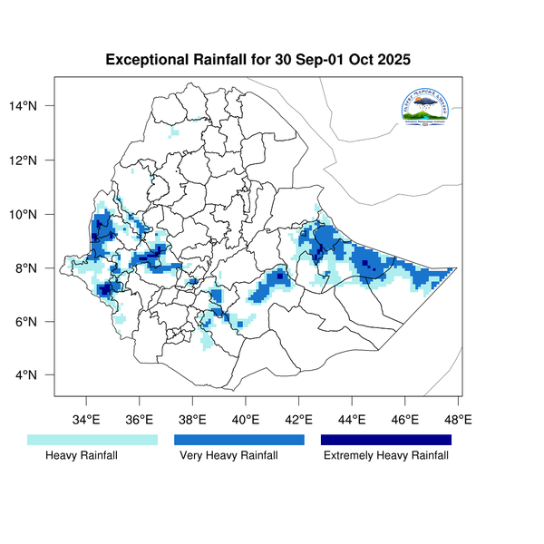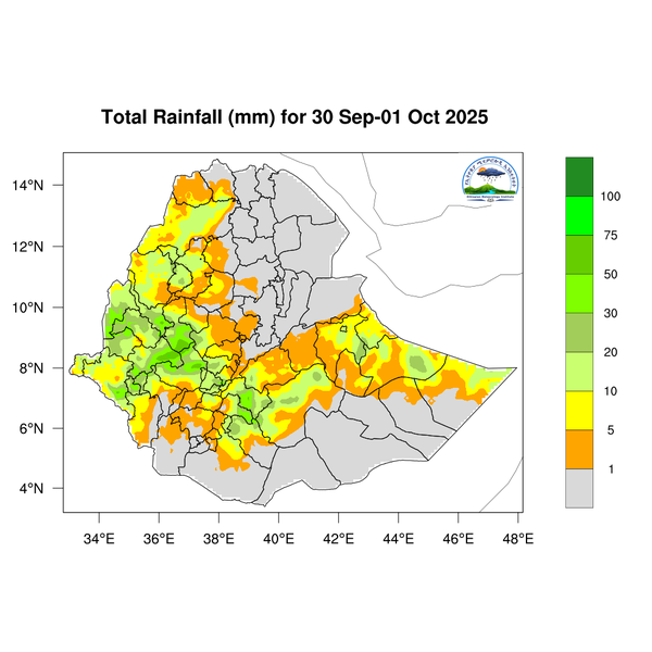 Light to heavy rainfall is expected over western Tigray, Amhara, Benishangul Gumuz, Gambella, Oromia, Southwest Ethiopia, northern portions of South Ethiopia, Central Ethiopia, Sidama, Dire Dawa, Harari, and northern Somali regions.