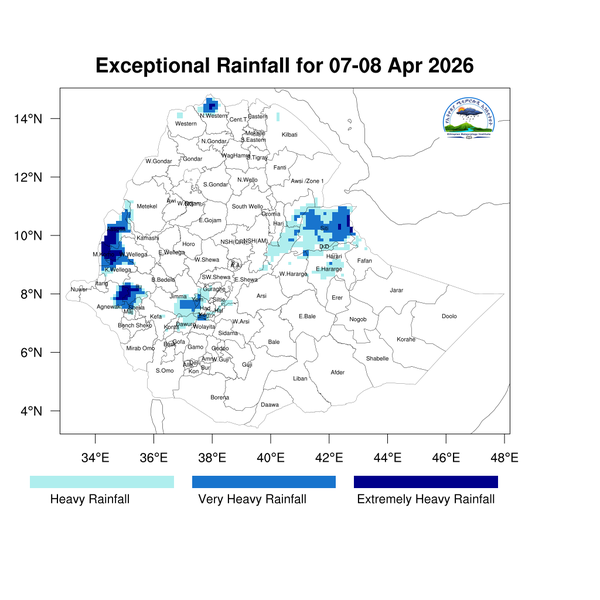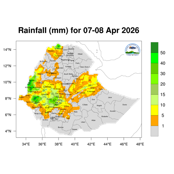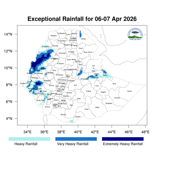 Light to heavy rainfall is expected over western Tigray, western Amhara, western, eastern, and southern Oromia, Benishangul-Gumuz, Gambella, Central Ethiopia, Southwest Ethiopia, Sidama, South Ethiopia, South Afar, and northern Somali region.