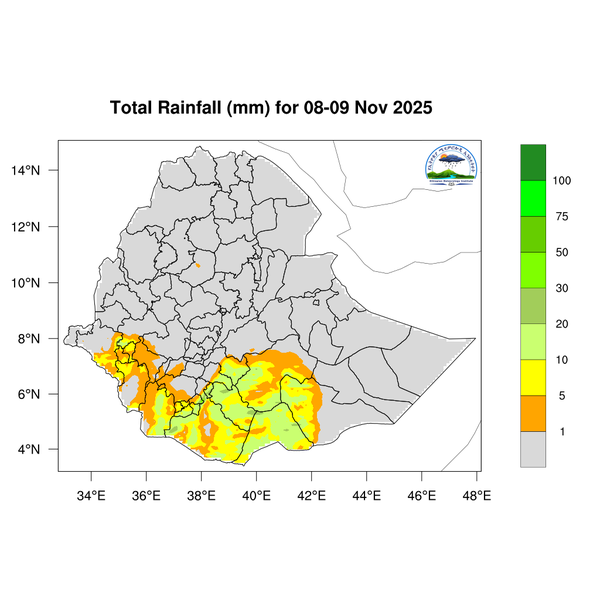 Light to moderate rainfall is expected over South Ethiopia , Southwest Ethiopia, central Ethiopia regions, western and southern Somali, Sidama, Southern highlands and southern Oromia.