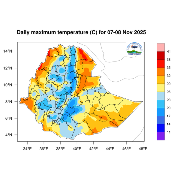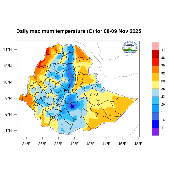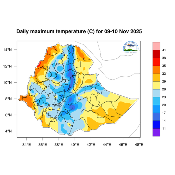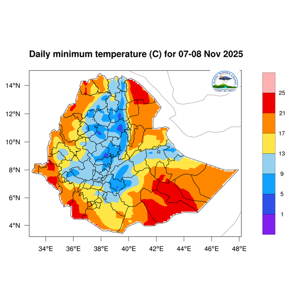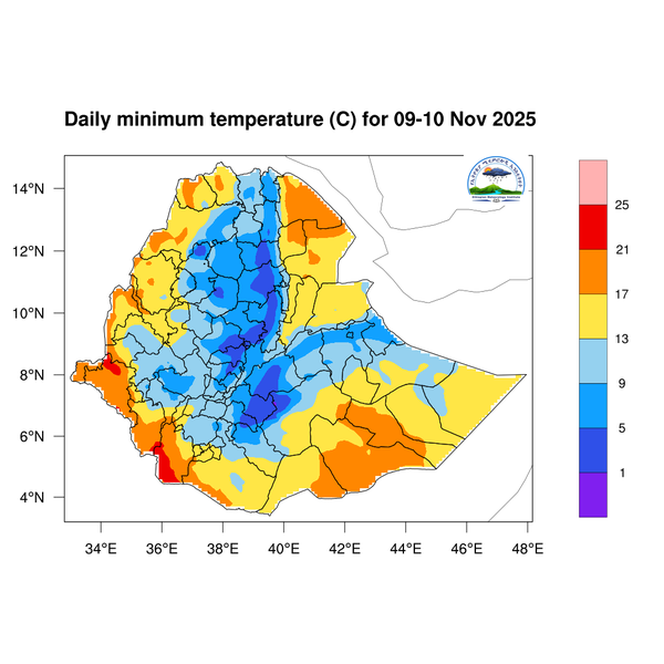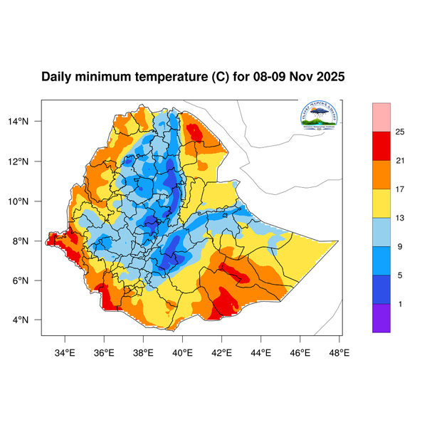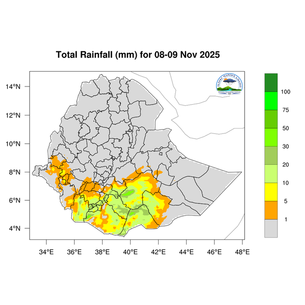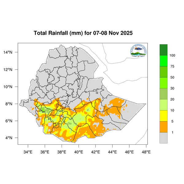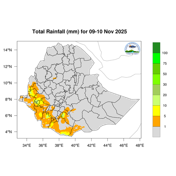 Light to moderate rainfall is expected across South Ethiopia, Southwest Ethiopia, the Central Ethiopia region, western and southern Somali, Sidama, the Southern Highlands, and western and southern Oromia.