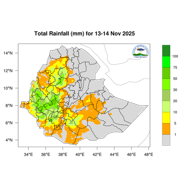 Light to moderate rainfall is expected over central and western Amhara, central Ethiopia, South Ethiopia, Southwest Ethiopia regions, Gambella, Sidama, western and southern Oromia