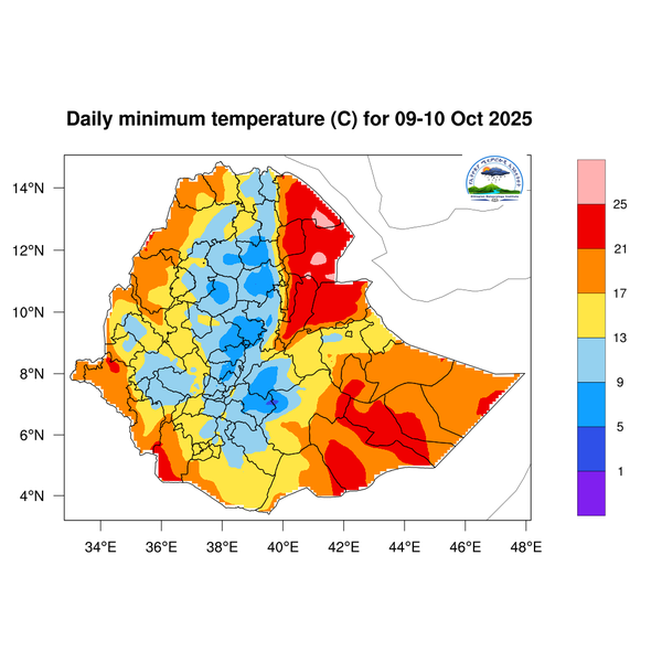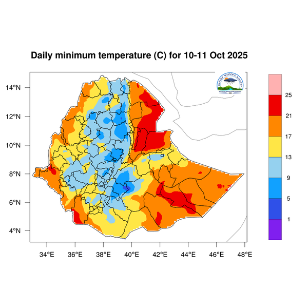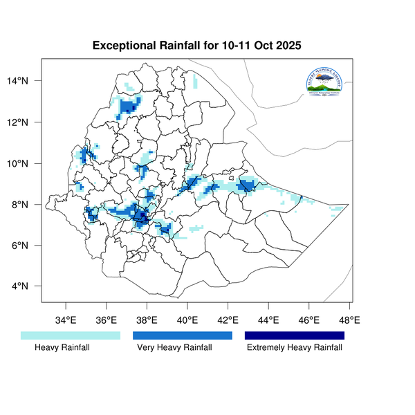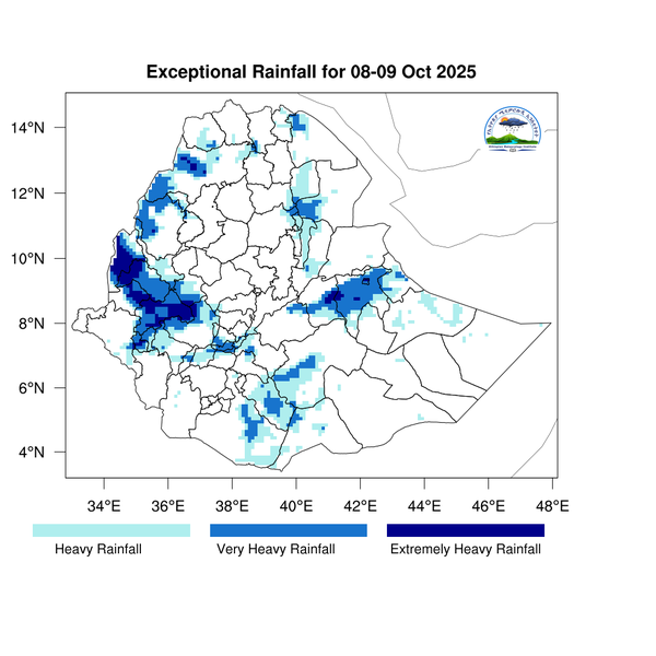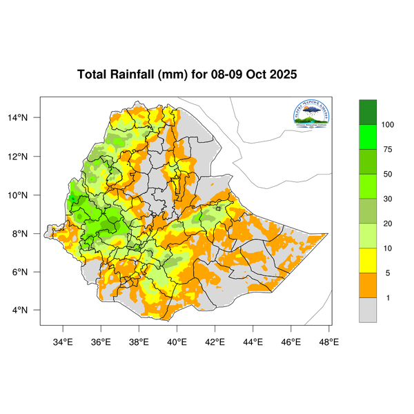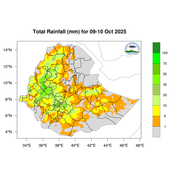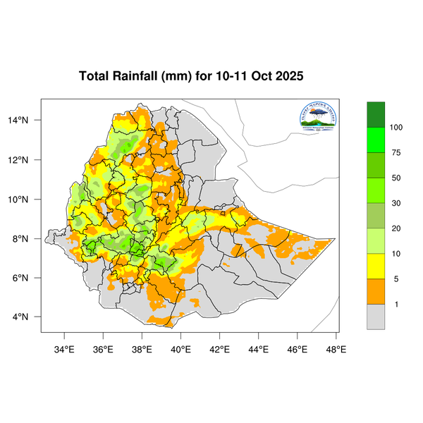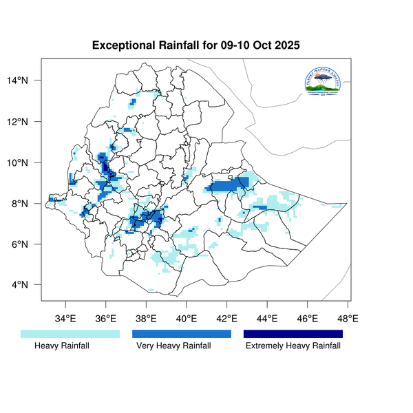 Light to moderate rainfall is anticipated over western Tigray, Amhara, southern, central, eastern, and southern highlands of Oromia , Gambella, Southwest Ethiopia, central Ethiopia, and south Ethiopia regions, southern Afar, northern Somali and Sidama, with heavy rainfall on pocket area of western Oromia and Benishangul Gumuz