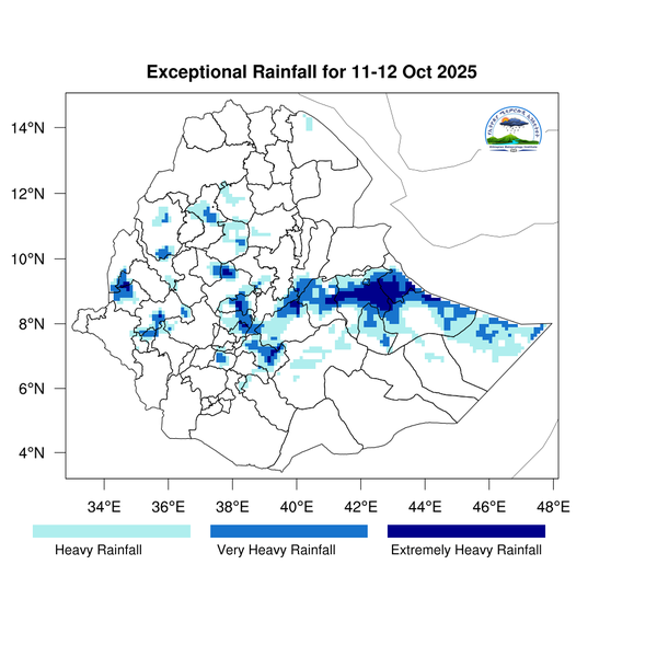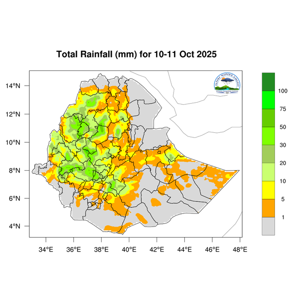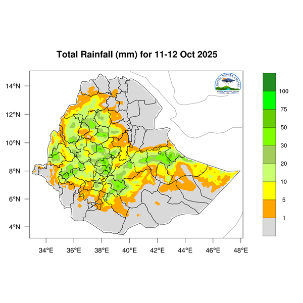 Light to moderate rainfall is anticipated over Tigray, Amhara, central, eastern, southern and southern highlands of Oromia, Gambella, Southwest Ethiopia, central Ethiopia, and south Ethiopia regions, southern Afar, and Sidama, with heavy rainfall on pocket area of western Oromia, and northern Somali.