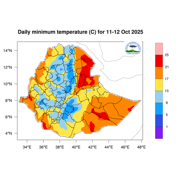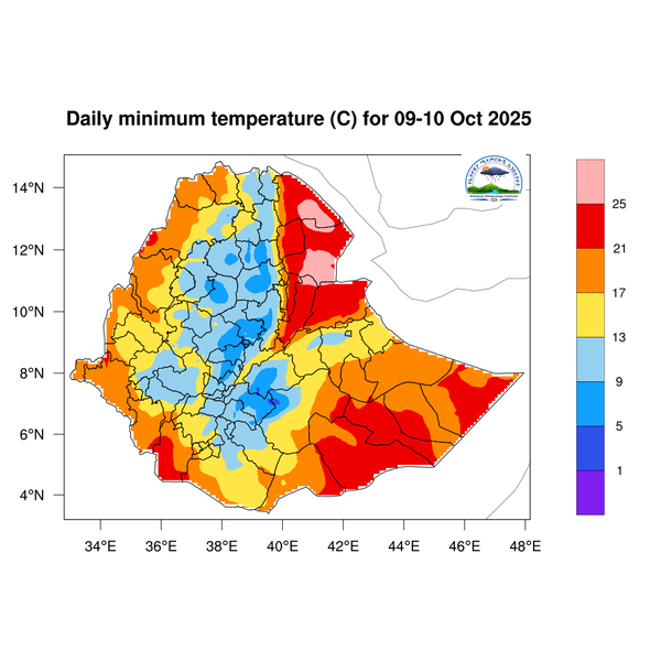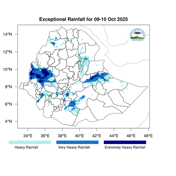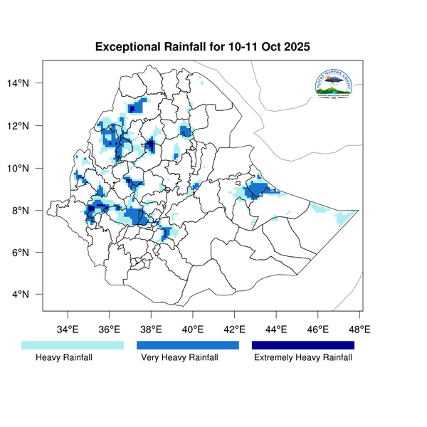 Light to moderate rainfall is anticipated over Tigray, Amhara, central, eastern, southern and southern highlands of Oromia, Gambella, Southwest Ethiopia, central Ethiopia, and south Ethiopia regions, southern Afar, and Sidama, with heavy rainfall on pocket area of western Oromia, northern Somali and Benishangul Gumuz.