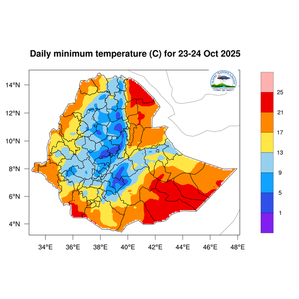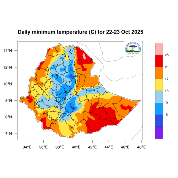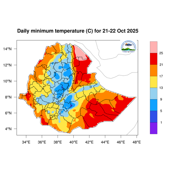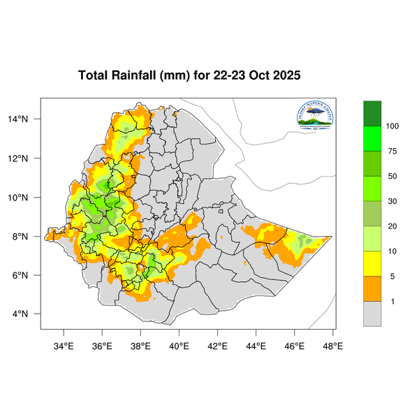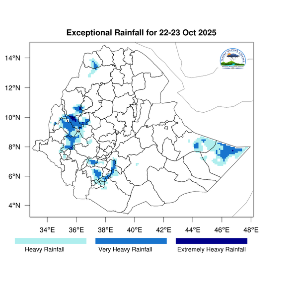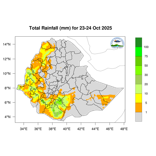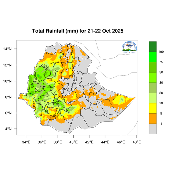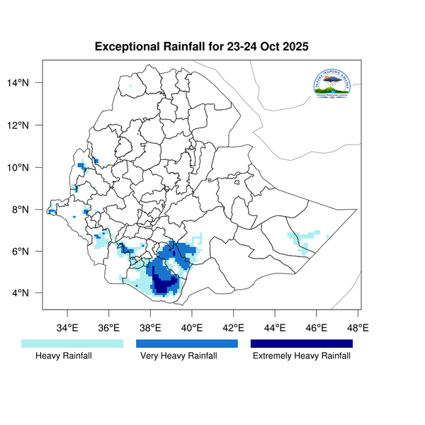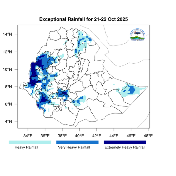 Light to moderate rainfall is anticipated over western Tigray, Amhara, western, central, and southern Oromia, Gambella, Southwest Ethiopia, central Ethiopia, and south Ethiopia regions, Benishangul Gumuz, eastern Somali, northern Afar and Sidama, with heavy rainfall on pocket area of western Oromia, Benishangul Gumuz, western Amhara, and Sidama.