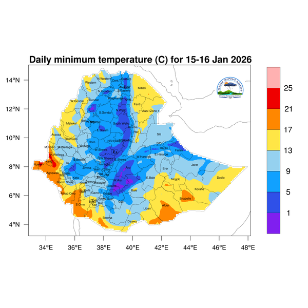 Minimum temperature is expected to drop below 5°C over eastern Amhara, central and southern highlands of Oromia.