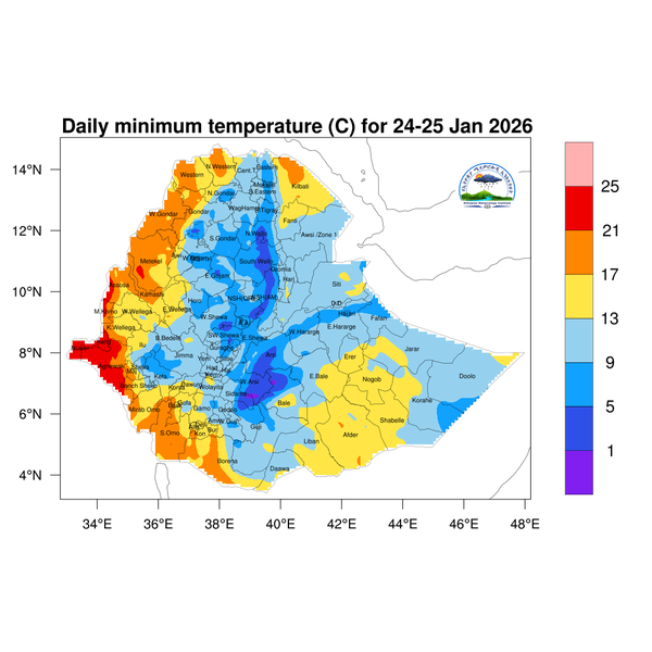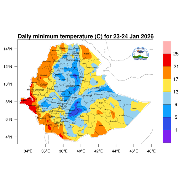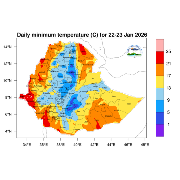 Pocket places in eastern Amhara, as well as the central and southern highlands of Oromia, will experience minimum temperatures below 5°C.