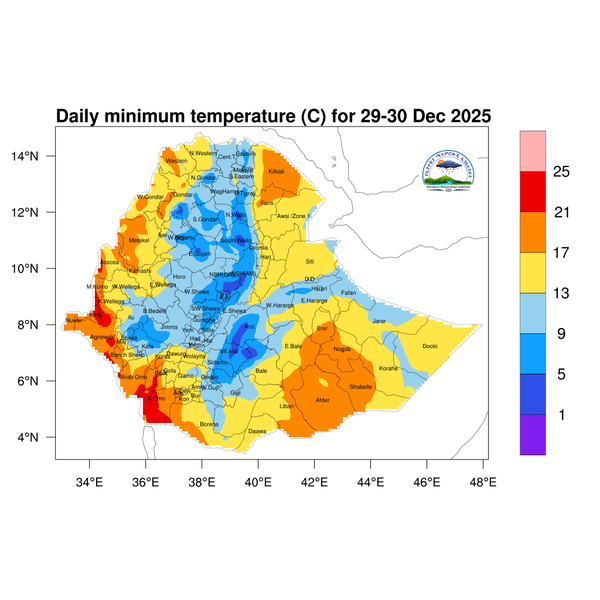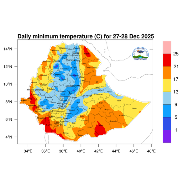 The daily minimum temperature is expected to be below 5 degrees Celsius across the central and southern highlands of Oromia and east and central Amhara.
