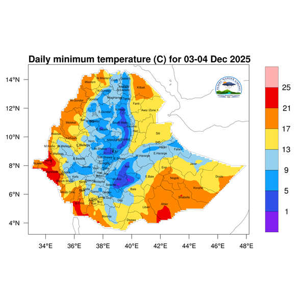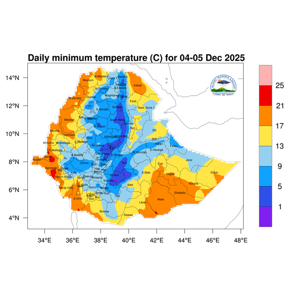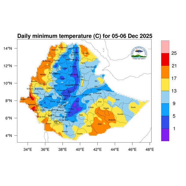 The daily minimum temperature is expected below 5 degree Celsius on central and Southern highlands of Oromia, and central and eastern Amhara. In association with this; the early morning and night time coldness will continue increasing manner over the mentioned area. On the other hand, windy , dry,and sunny weather condition will continue over most parts of the country.