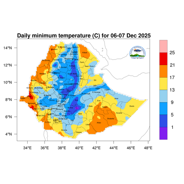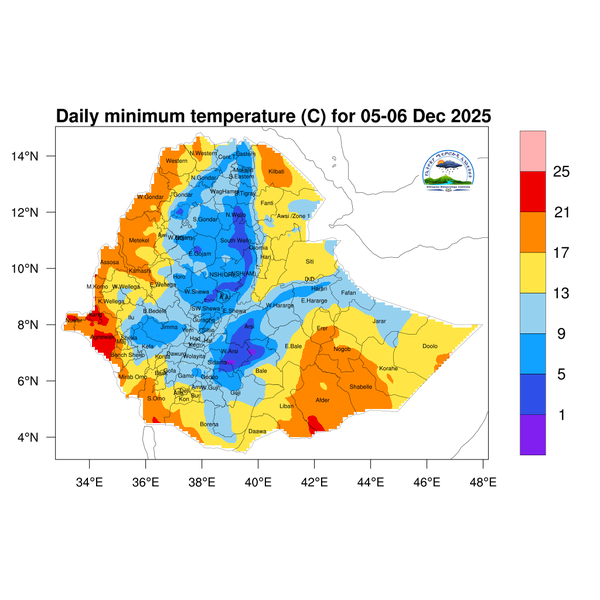 Daily minimum temperature is expected to drop below 5 degree Celsius on central and Southern highlands of Oromia, and eastern Amhara. In association with this; the early morning and nighttime coldness will continue in similar manner over the mentioned area. On the other hand, windy, dry, and sunny weather condition will prevail over most parts of the country.