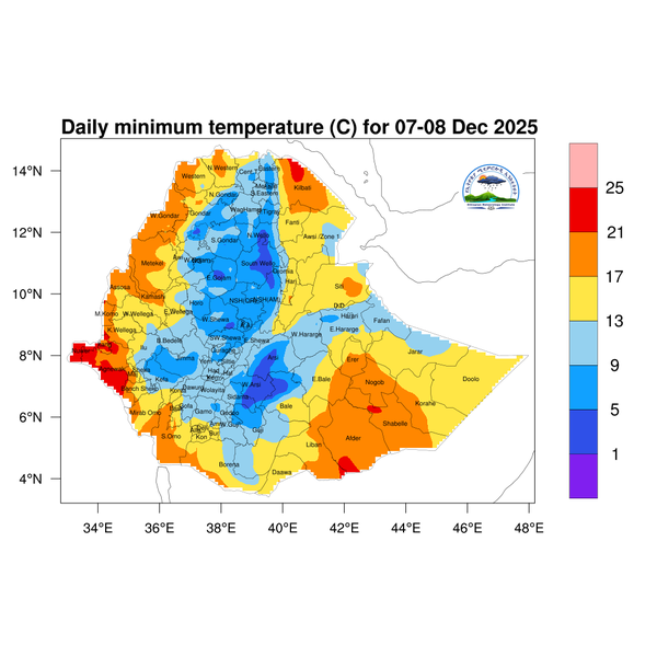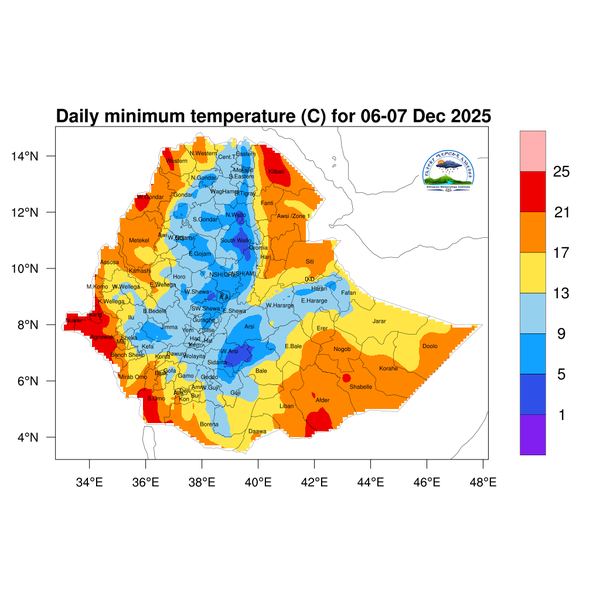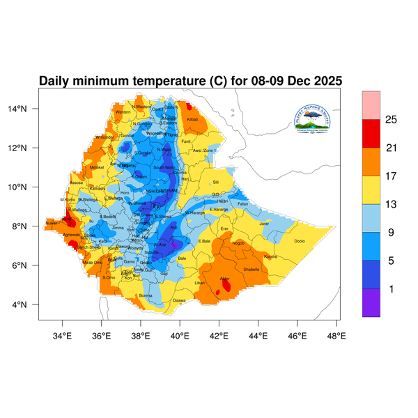 The daily minimum temperature is expected below 5 degree Celsius on eastern, central and Southern highlands of Oromia, and eastern Amhara. In association with this; the early morning and night time coldness will continue in a similar manner over the mentioned area.