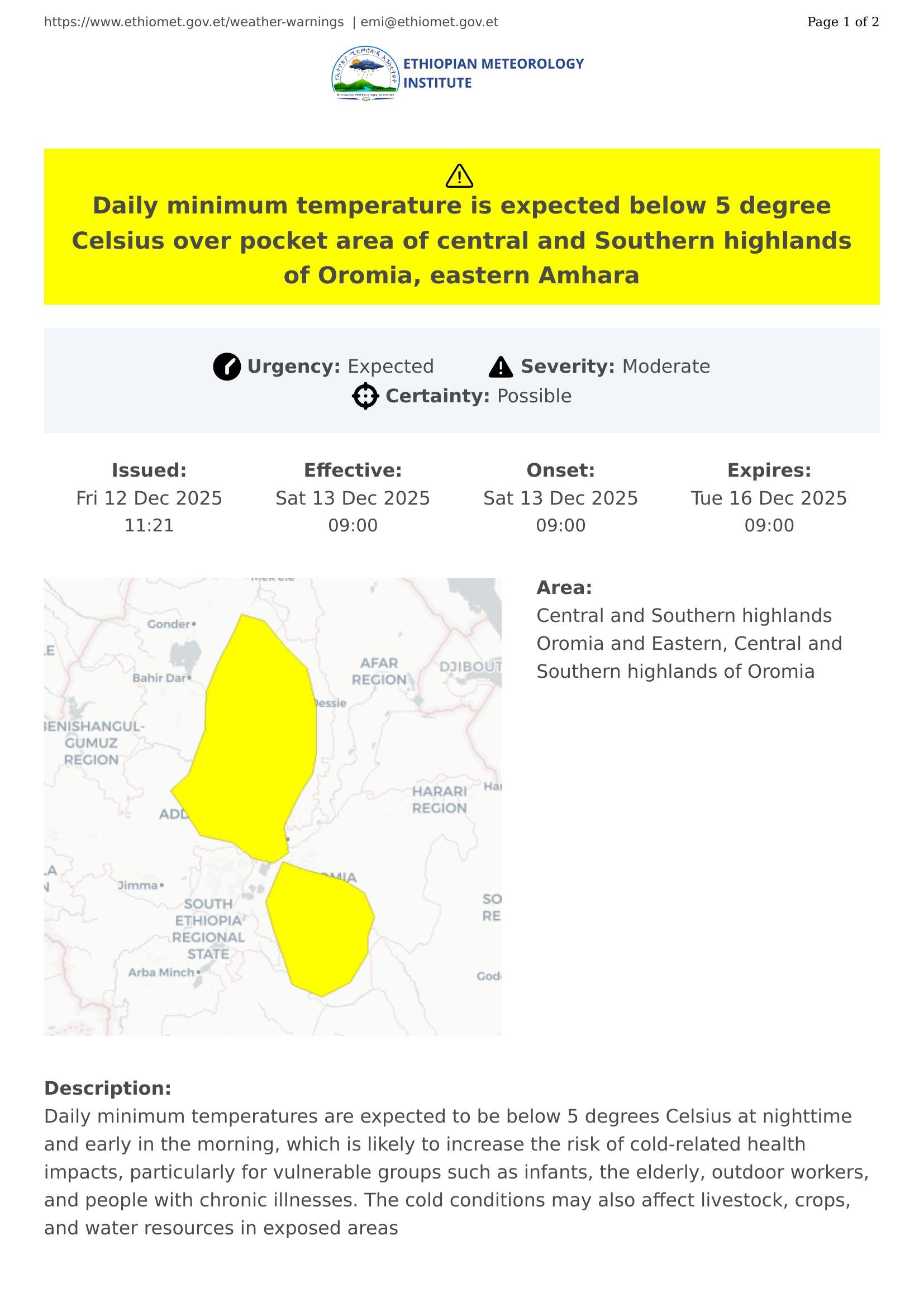 Daily minimum temperature is expected below 5 degree Celsius over pocket area of central and Southern highlands of Oromia, eastern Amhara
